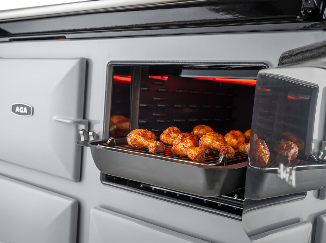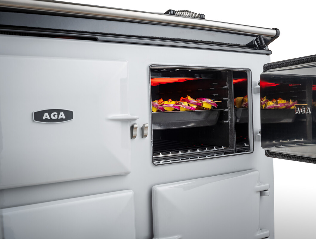 The AGA eR7i 210-7g offers cast-iron radiant heat cooking combined with innovative technology to provide additional range cooker capabilities. This range cooker offers two cast-iron heat storage cookers for roasting, baking and simmering, alongside a conventional fan oven. The roasting and baking ovens offer ultimate precision with additional pre-set temperatures for accurate cooking, controlled by a state-of-the-art touch screen.